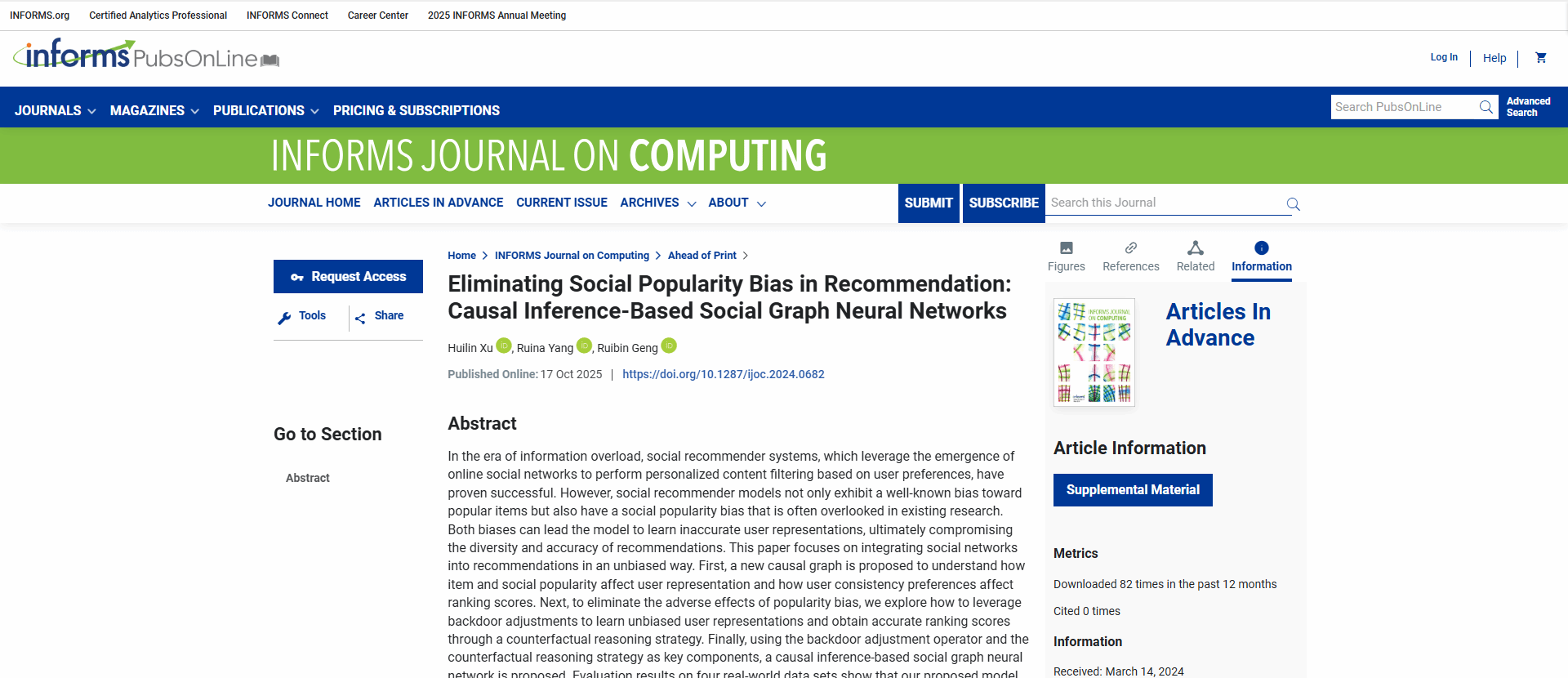 近日,国际运筹学与管理科学学会(INFORMS)旗下期刊《INFORMS Journal on Computing》在线发表了西北工业大学管理学院副教授、博士生导师耿瑞彬与合作者的最新研究成果——题为 “Eliminating Social Popularity Bias in Recommendation: Causal Inference-Based Social Graph Neural Networks”(《消除推荐系统中的社会流行度偏差:基于因果推理的社会图神经网络》)的论文, 耿瑞彬副教授为通讯作者。该研究聚焦于社交推荐系统中的“社会流行度偏差”问题。传统推荐算法容易偏向热门内容,而在社交网络环境中,这种偏差会被“社会影响力”进一步放大,导致推荐结果集中于意见领袖或高影响力用户关注的内容,从而损害信息多样性与公平性。