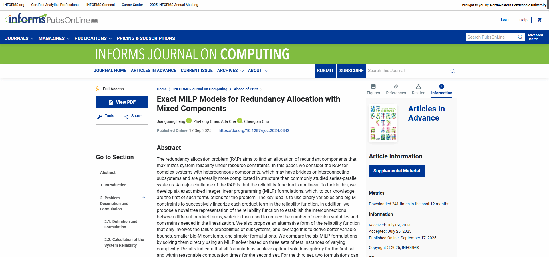 近日,《INFORMS Journal on Computing》期刊在线刊发了西北工业大学管理学院冯建广副教授的研究成果“Exact MILP Models for Redundancy Allocation with Mixed Components”,管理学院副教授冯建广为论文第一作者、车阿大教授为论文通讯作者。该研究聚焦于系统设计中的冗余分配问题(RAP),这一问题旨在有限资源条件下,通过合理配置冗余部件来最大化系统可靠性。本研究针对包含异质部件和复杂结构的情境,提出对非线性可靠性函数的逐步线性化方式,构建了多种精确混合整数线性规划(MILP)模型,并通过树形结构表示大幅减少模型的决策变量与约束数量。计算结果显示了所开发模型与方法的高效求解性能,尤其在大规模复杂系统中表现出稳健性和可扩展性,显著优于现有分支定界方法。