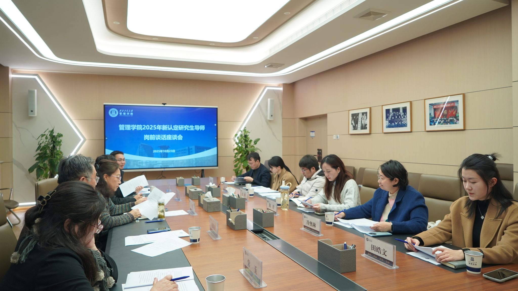 为进一步加强研究生导师队伍建设,规范研究生导师指导行为,强化导师立德树人职责,增强导师岗位责任意识,管理学院于10月23日下午召开了2025年新认定研究生导师岗前谈话座谈会。学院党委书记张爽、党委副书记王海啸、院长助理洪兆富、资深导师代表赵嵩正教授、常玉教授及本年度新认定的研究生导师参加了本次座谈会。会议由院长助理洪兆富主持。