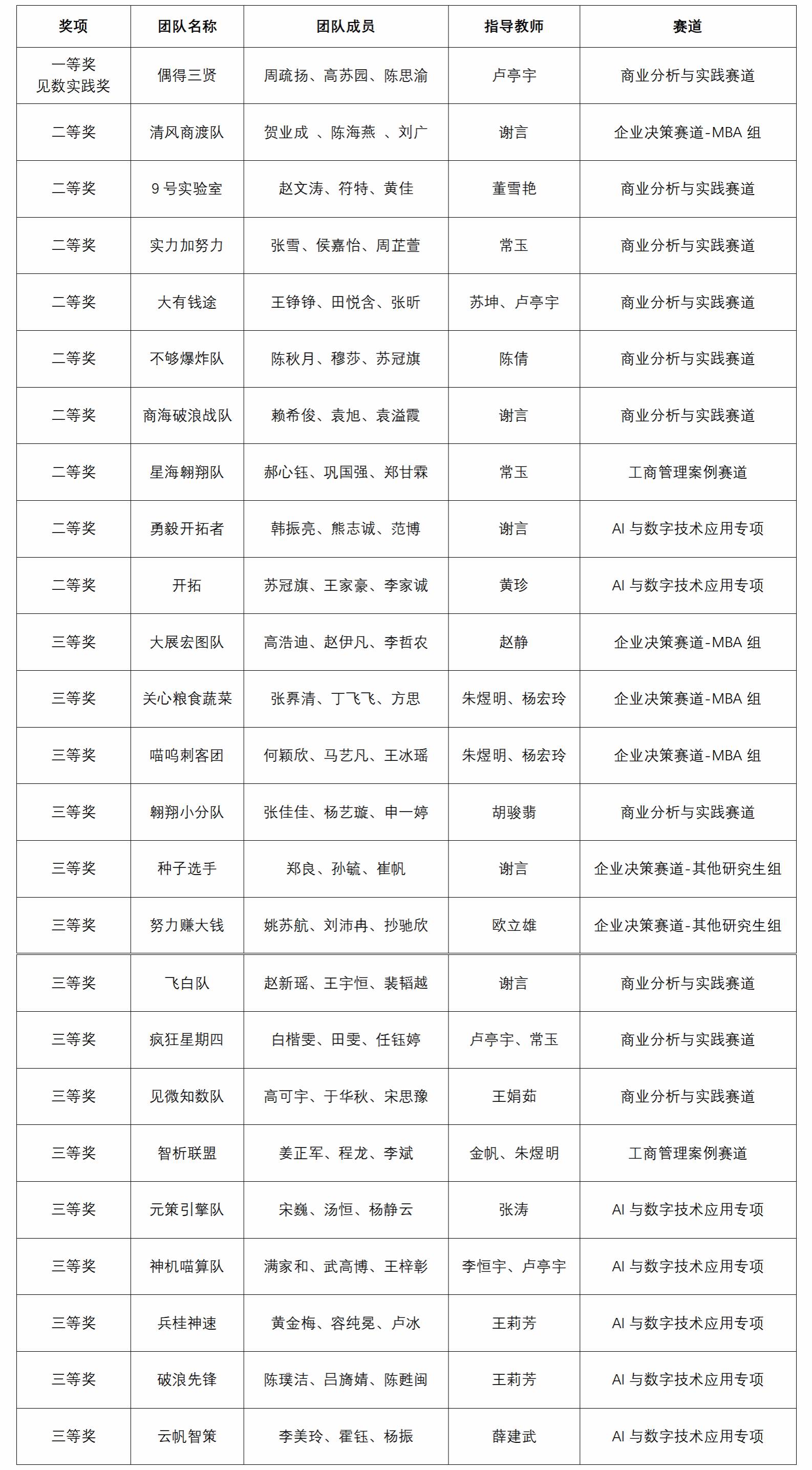 本届大赛聚焦数智时代企业管理核心挑战,设企业决策赛道,商业分析与实践赛道,工商管理案例赛道和AI与数字技术应用专项赛道,对参赛团队的理论应用、数据洞察与解决方案落地能力提出了更高要求。我院在各赛道均展现强劲竞争力,实现“多点开花”。商业分析与实践赛道不仅斩获全国一等奖1项、二等奖5项、三等奖4项,更凭借“偶得三贤”团队的出色实践应用成果,赢得命题企业高度评价,成功拿下该赛道最高荣誉“见数实践奖”,团队指导老师卢亭宇亦获评“优秀指导老师奖”。企业决策赛道收获二等奖1项、三等奖5项;工商管理案例与数字技术赛道获二等奖和三等奖各1项;AI与数字技术应用专项赛道获二等奖2项、三等奖5项。