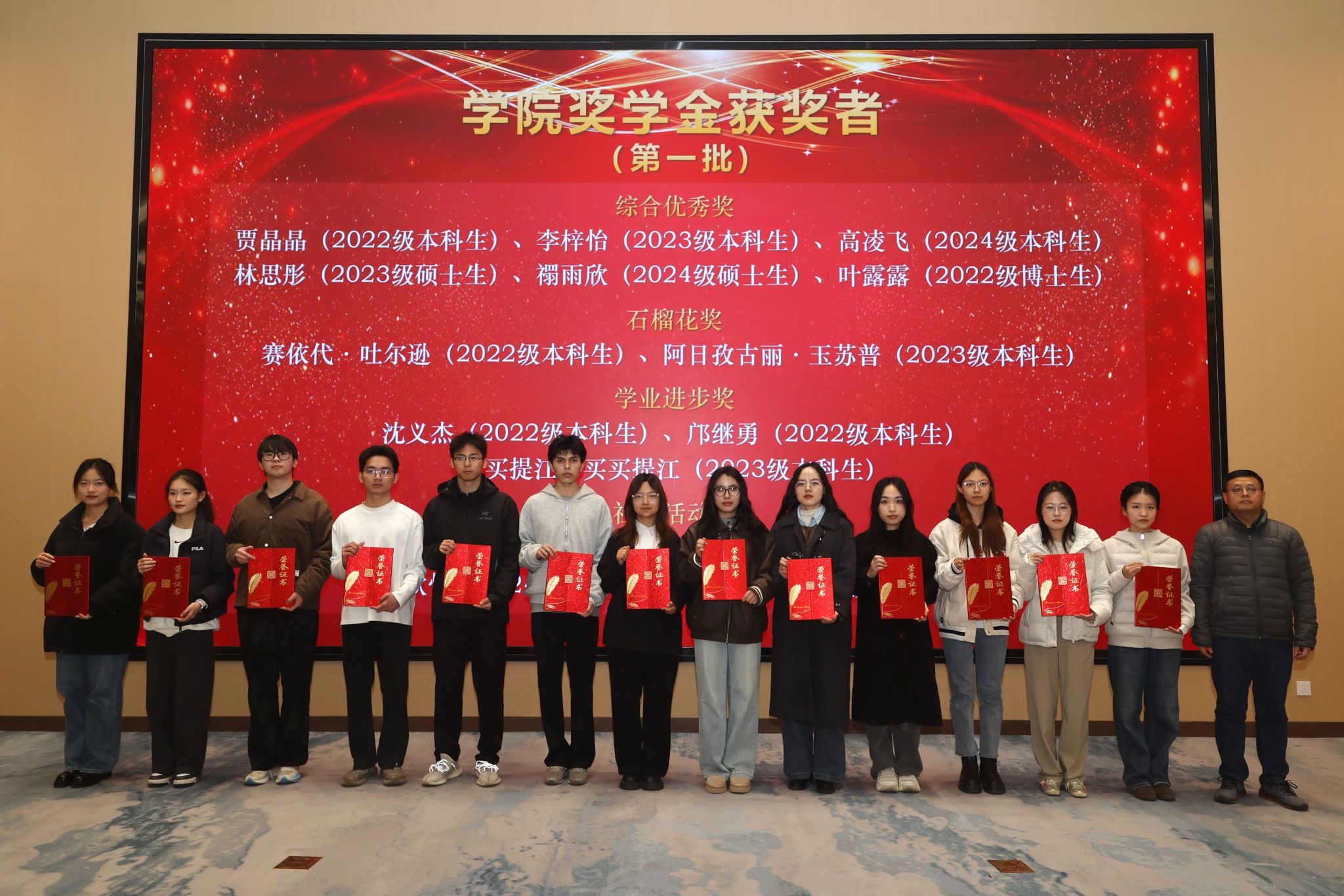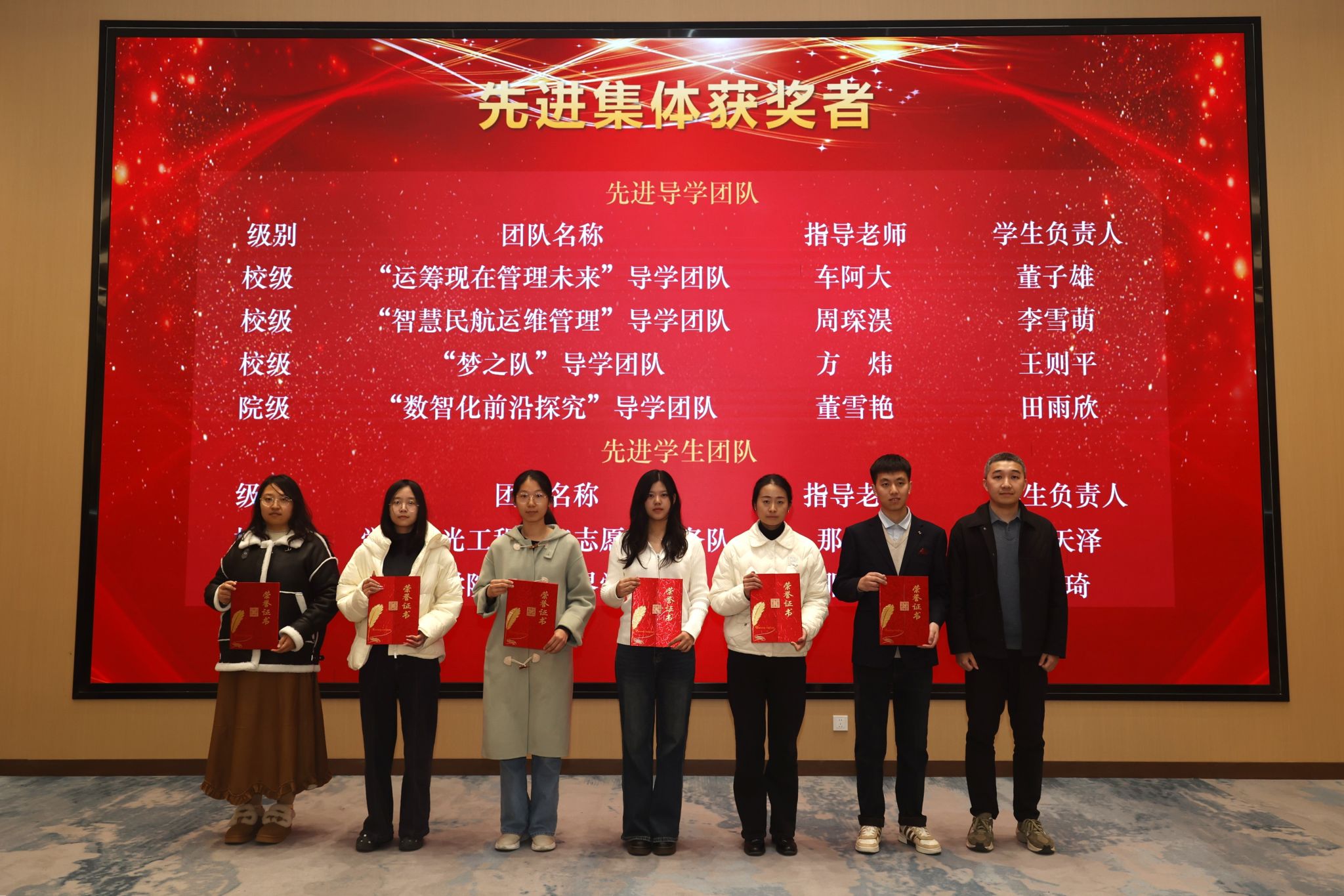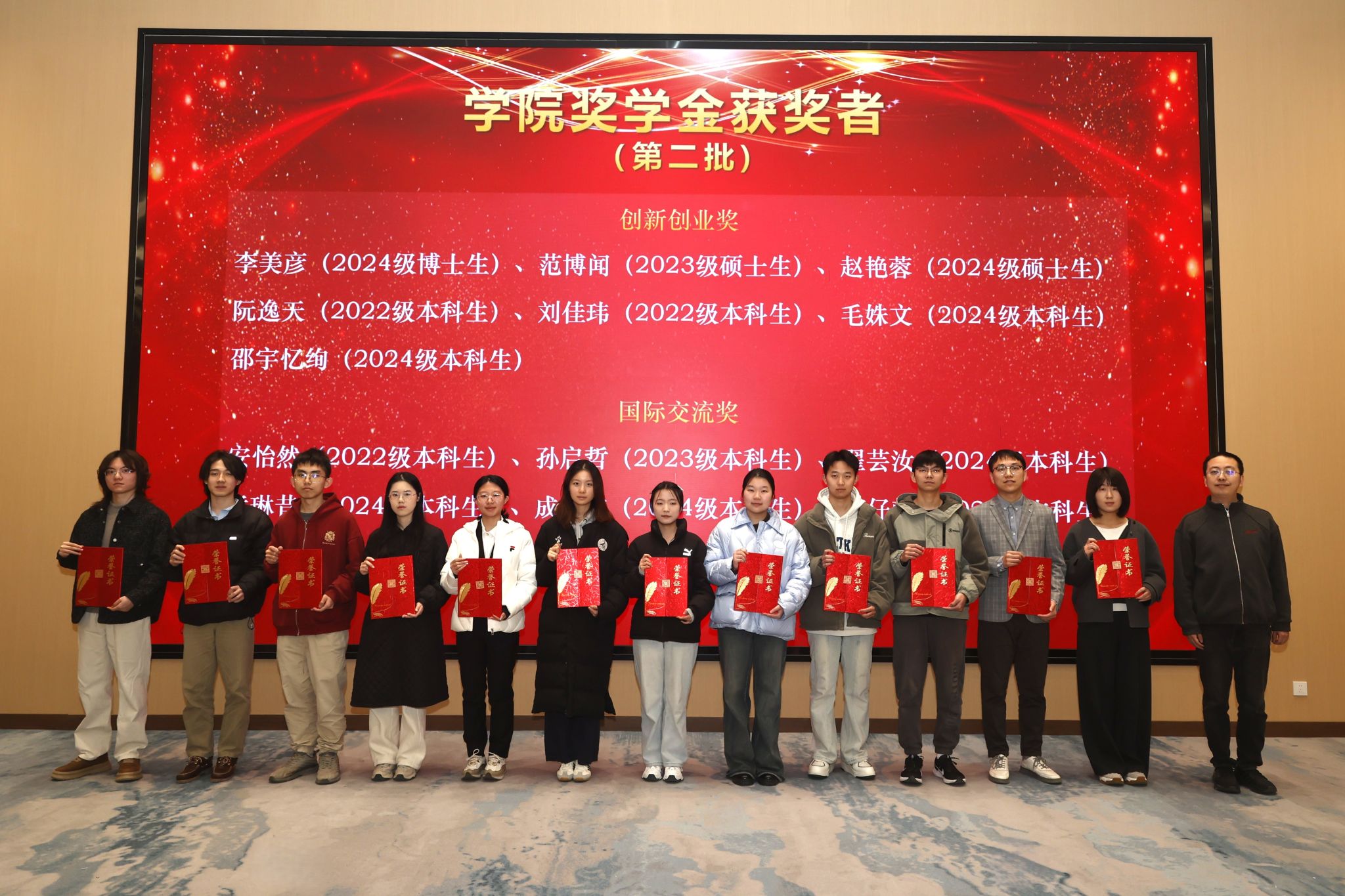 本次大会表彰了2024-2025学年获得各级各类荣誉奖励的先进集体和优秀个人,包括在党内、团内表彰中获奖的集体7个、个人58人次,国家奖学金获得者28人、专项奖学金获得者25人、校级奖学金172人、院级奖学金29人,校级先进集体11个、院级先进集体4个。
