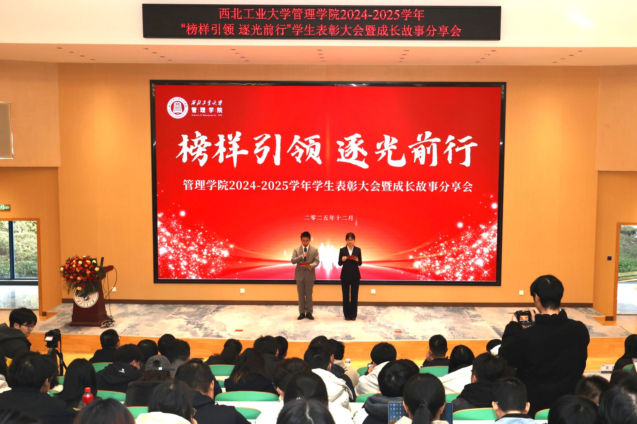 为表彰先进、选树榜样,营造积极向上、争先创优的育人氛围,12月18日下午,管理学院在长安校区教学西楼A100报告厅隆重举行2024-2025学年“榜样引领 逐光前行”学生表彰大会暨成长故事分享会,共同见证荣耀时刻、分享成长收获。学校党委学生工作部部长、学生处处长于辉,管理学院党委书记张爽、院长车阿大、副院长陈琳、副书记王海啸、院长助理李乘龙、班主任代表、全体学工干部、受表彰的先进集体和优秀学生代表、各年级学生代表共同参加了大会。2024级硕士生王萌和2024级本科生邓炅杰共同主持本次活动。