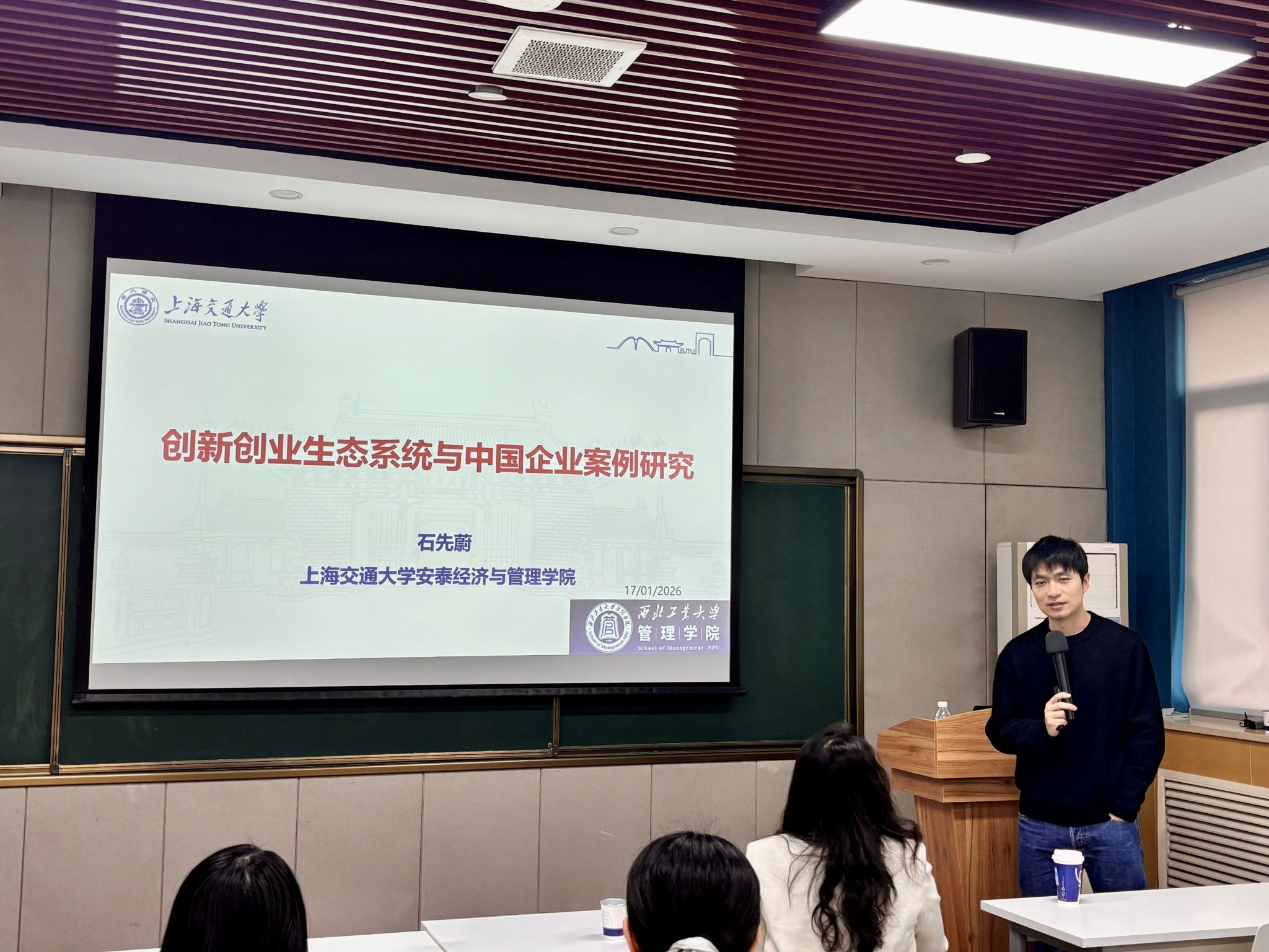 2026年1月17日,应管理学院邀请,上海交通大学安泰经济与管理学院副教授、博士生导师石先蔚在长安校区管理学院214报告厅,作了题为“创新创业生态系统与中国企业案例研究”的学术报告。本次报告由张莹副教授主持,学院工商管理、战略管理等方向的教师、博士生、研究生及部分本科生共40余人参加。