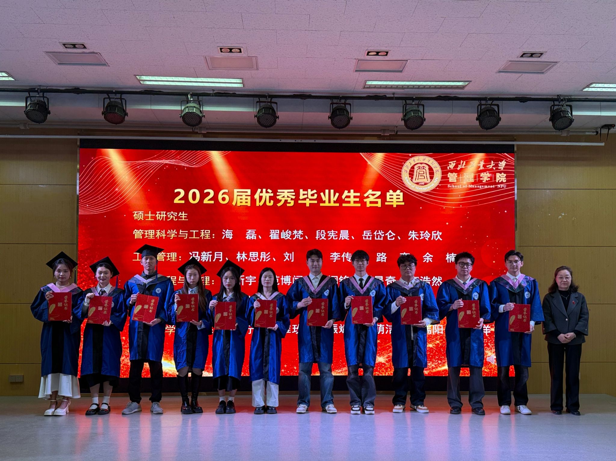 院长助理洪兆富宣读学位授予名单:李慧颖等39人符合博士学位授予条件,准予授予管理学博士学位;朱玲欣等72人、樊泽芃等60人符合硕士学位授予条件,分别授予管理学硕士学位和工程管理专业硕士学位。